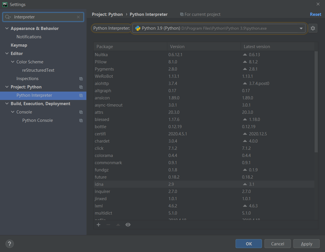 打开设置,搜索 Interpreter (如下图),就可以添加你的 Python 解释器了。
