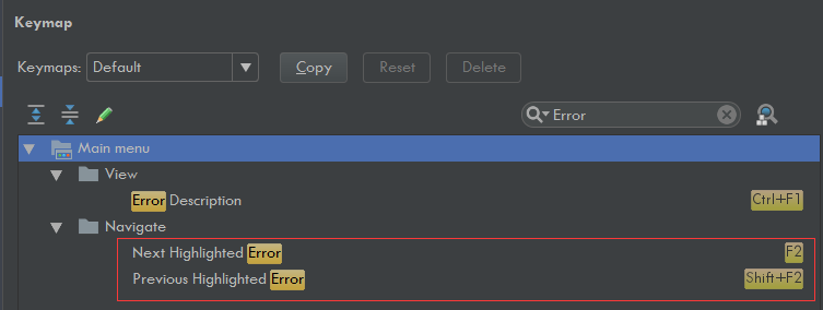 我在搜索框输入 Error,就找到了快速定位到错误位置的快捷键 F2Shift+F2 可以快速的定位到错误行。