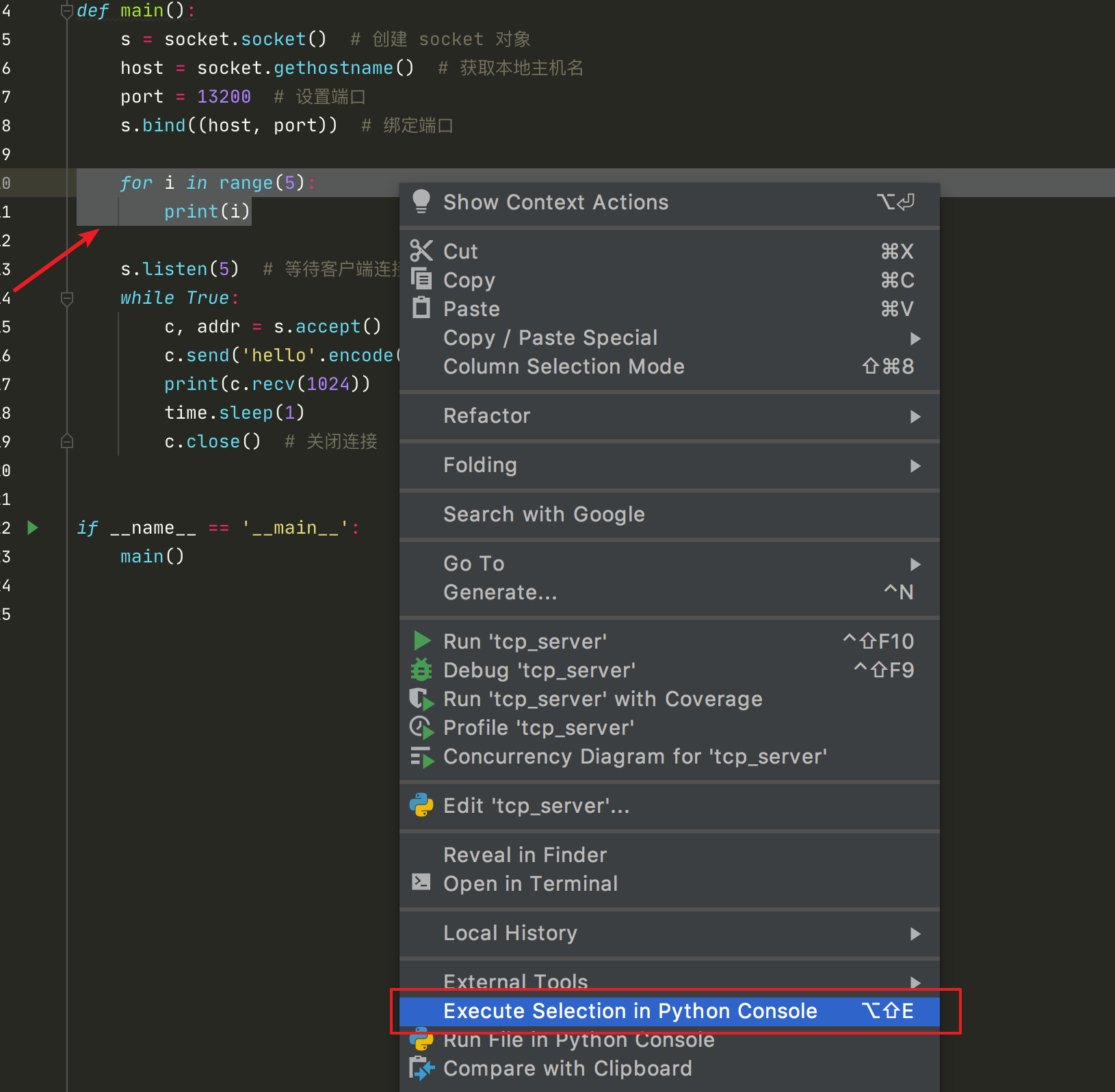 只要在当前文件中,写好代码,然后光标选择后,右键点击 Execute Selection in Python Console 或者 使用快捷键 option + shift + E (windows 上是 alt + shift + E)。