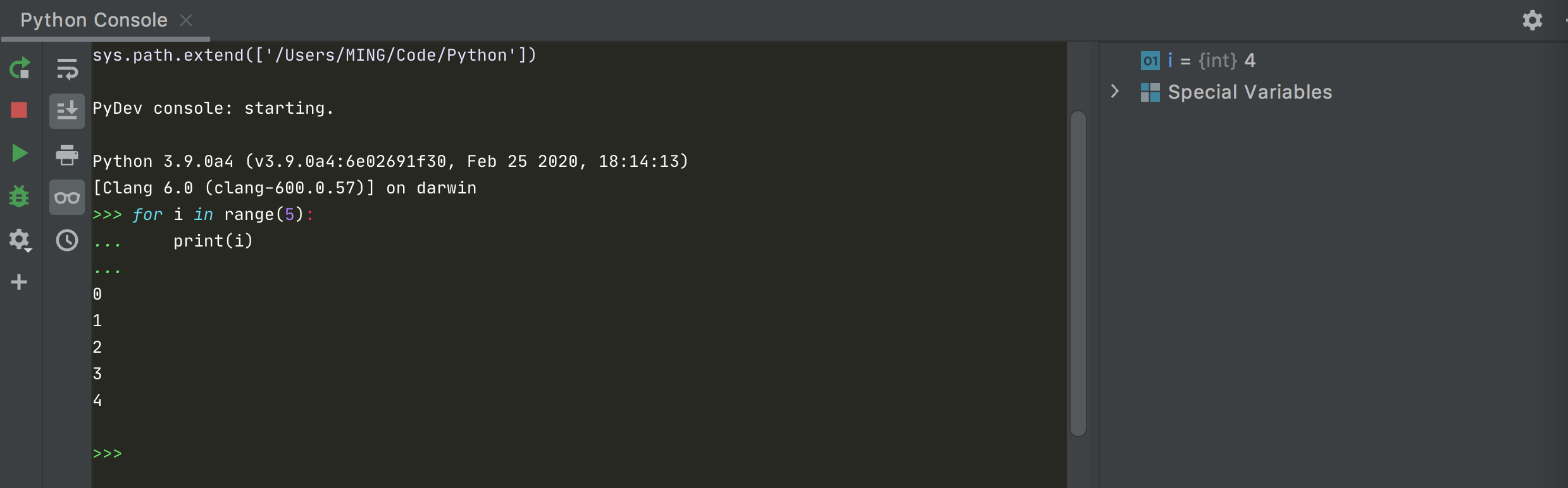 接着 PyCharm 就会弹出一个 Python Console 窗口,然后运行你所选择的代码。