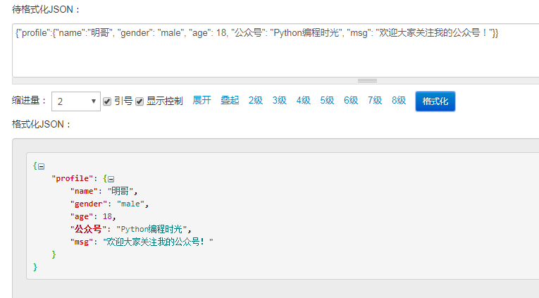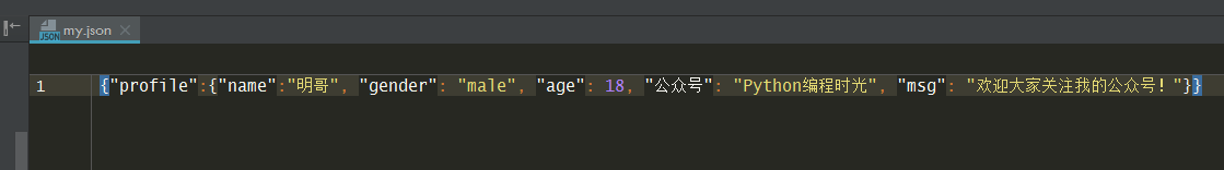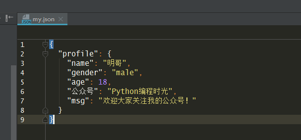 {"profile":{"name":"明哥", "gender": "male", "age": 18, "公众号": "Python编程时光", "msg": "欢迎大家关注我的公众号!"}}