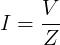 The load's current I in amps (A) is equal to the load's voltage VZ=V in volts (V) divided by the impedance Z in ohms (Ω):