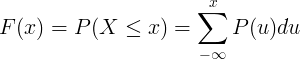 累积分布函数 F(x) 通过对离散随机变量 X 的概率质量函数 P(u) 求和计算。